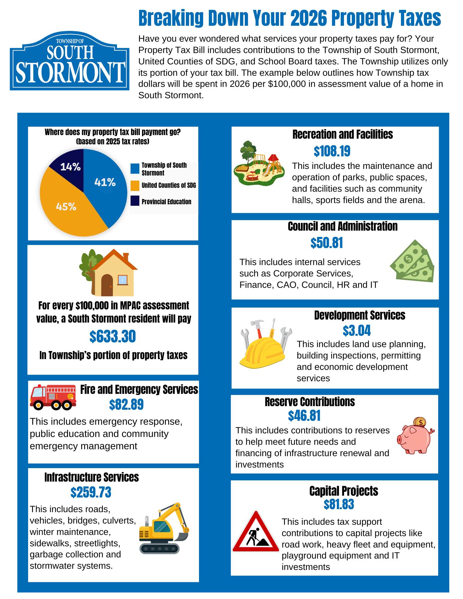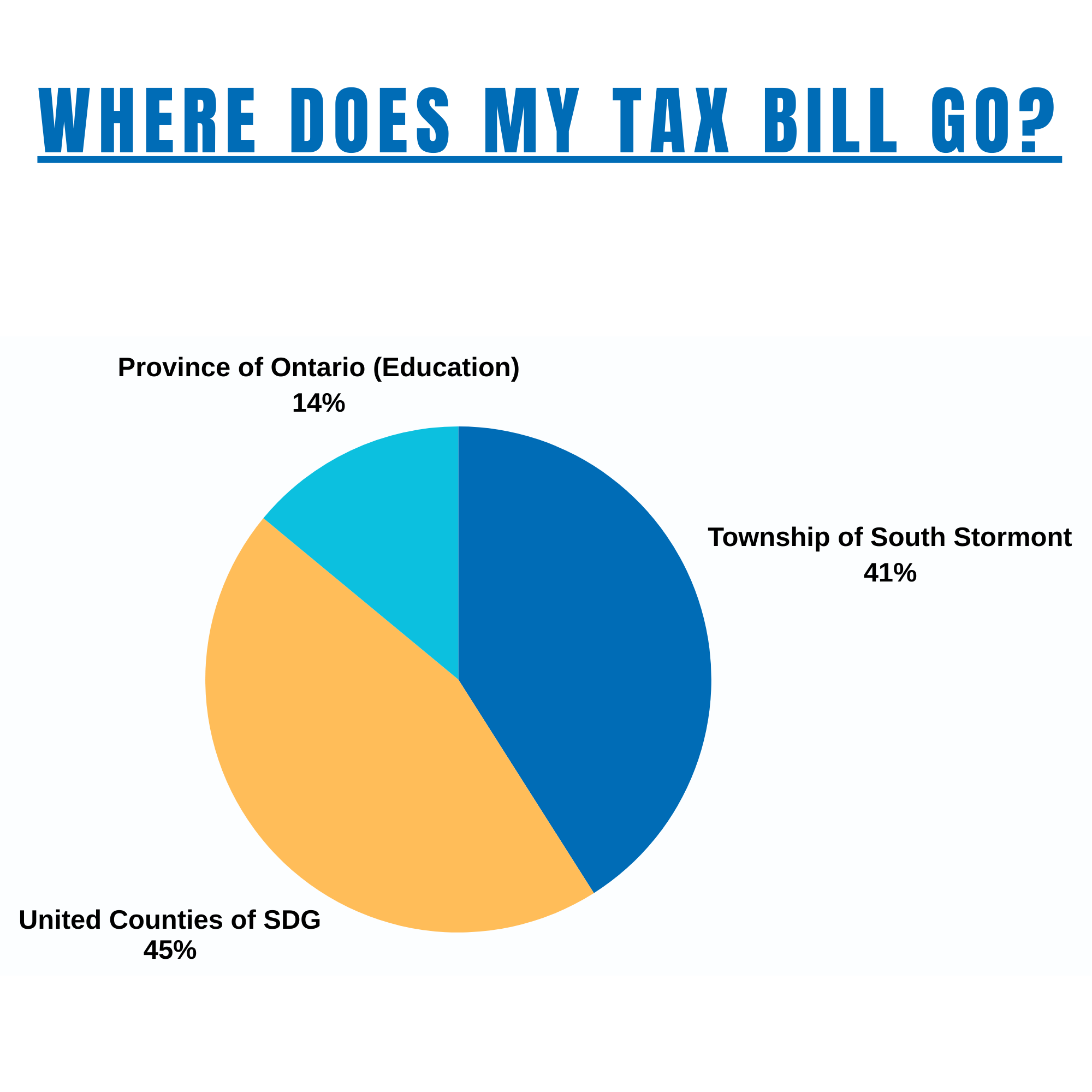 In 2026, 41% of your property tax bill will stay within the Township of South Stormont, while 45% will be transferred to the United Counties and 14% will be transferred to the Province for education.
